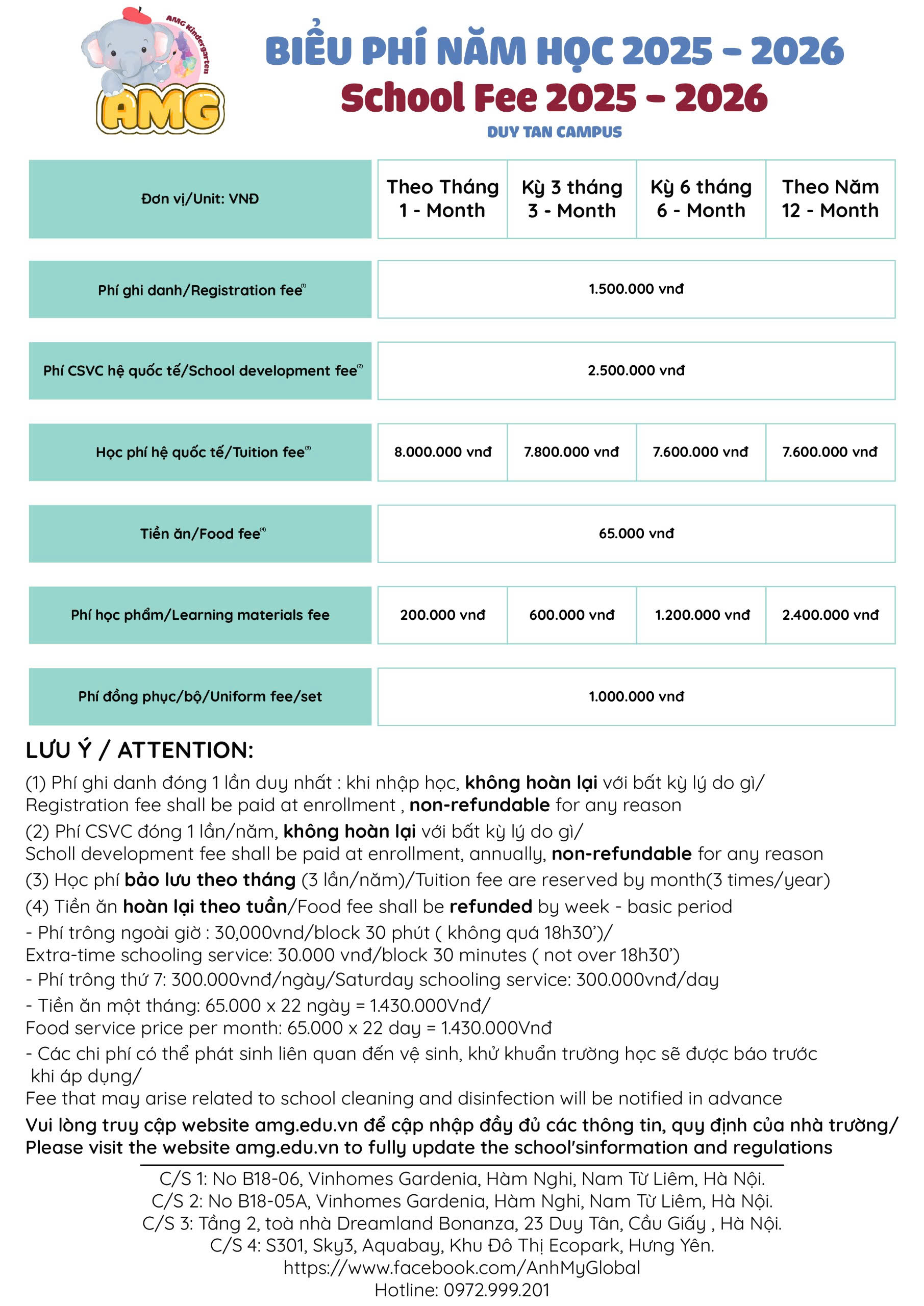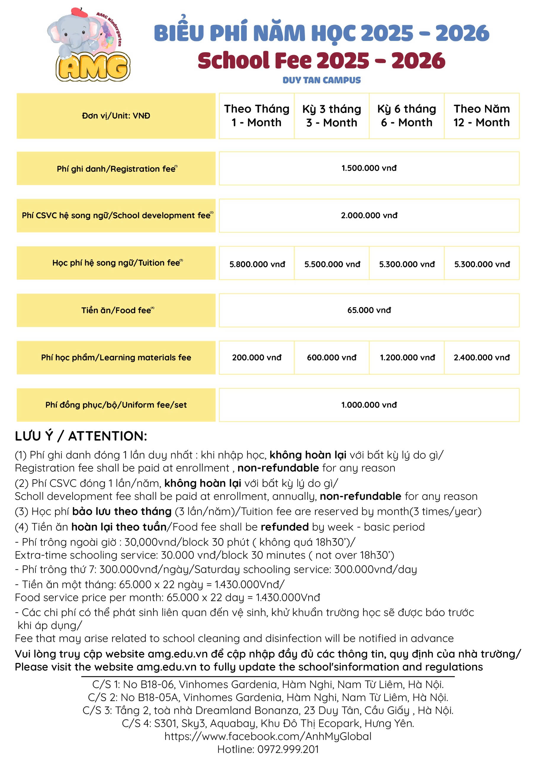 1. Biểu phí hệ song ngữ 1-6 tuổi